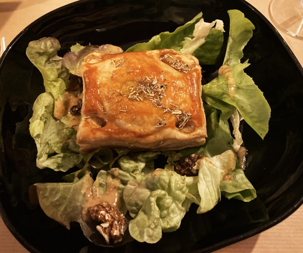 Hier nur ein Beispiel aus diesem Lokal, was wir so auf den Teller bekamen. Die Vorspeise mit einem Ziegenkäse in Blätterteig gebacken auf einem grünen Salat und mit etwas Herbes de Provence on top.