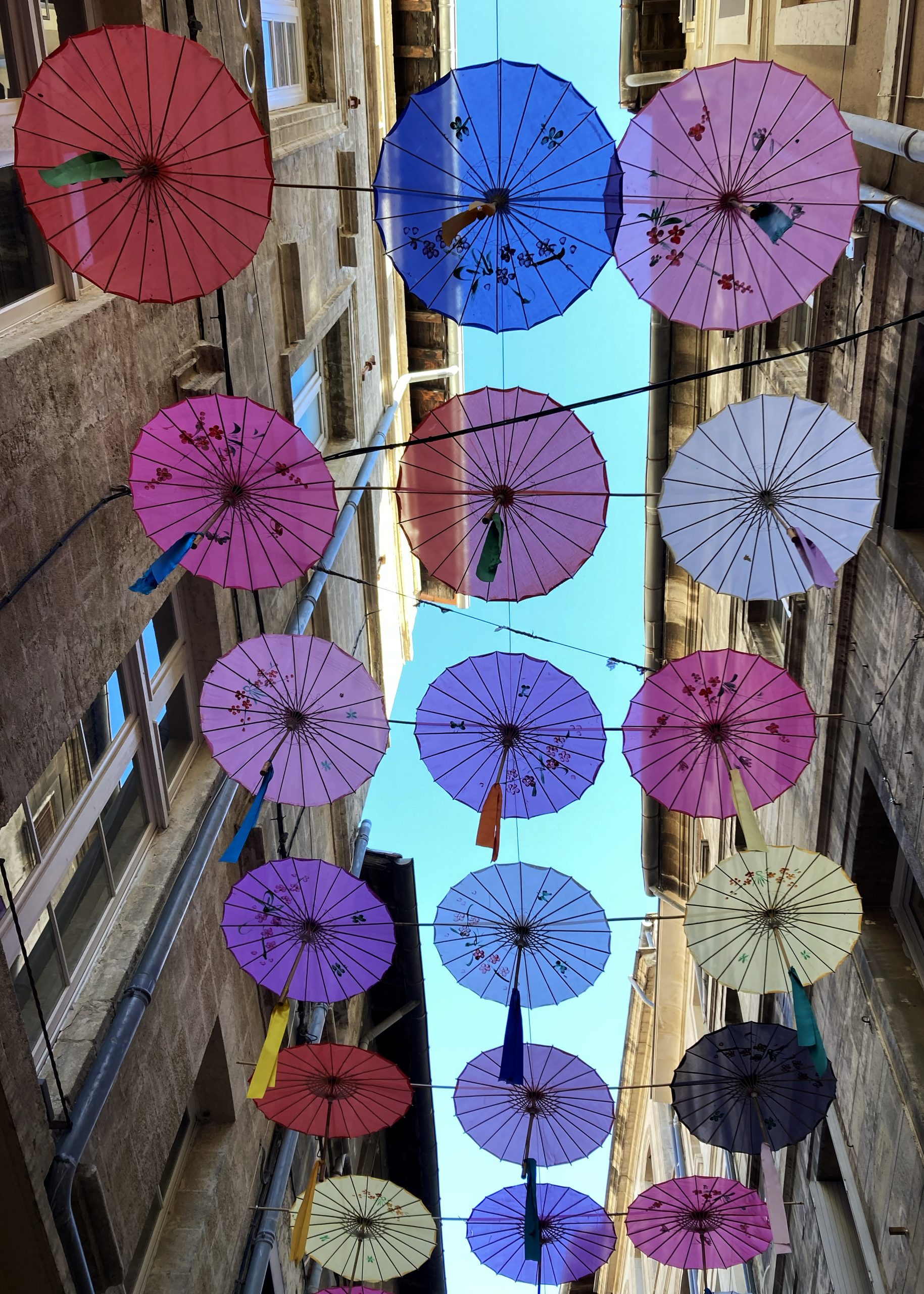 BELLA CIAO geht ja noch, aber sich als „Bäckerei Utopiste“ zu benennen ist schon eine gewagte, aber vielleicht auch interessante Seite der Backkunst. Nicht weit entfernt gab es eine recht schmale Gasse, wo sich viele bunte Sonnenschirme auf einer bestimmten Höhe befanden, was ich so fast identisch bereits vor einem Jahr in Tallinn/Estland gesehen hatte. Wer da wohl von wem abgeschaut hat?