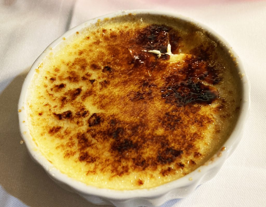 Und zum Dessert folgt dann ein französischer Klassiker – Crème brulée – die mit einer schön karamelisierten Zuckerschicht oben auf versehen war. Ist aber heute auch keine große Kunst, denn die wird auch in den großen Restaurants heute mit dem Bunsenbrenner hergestellt.