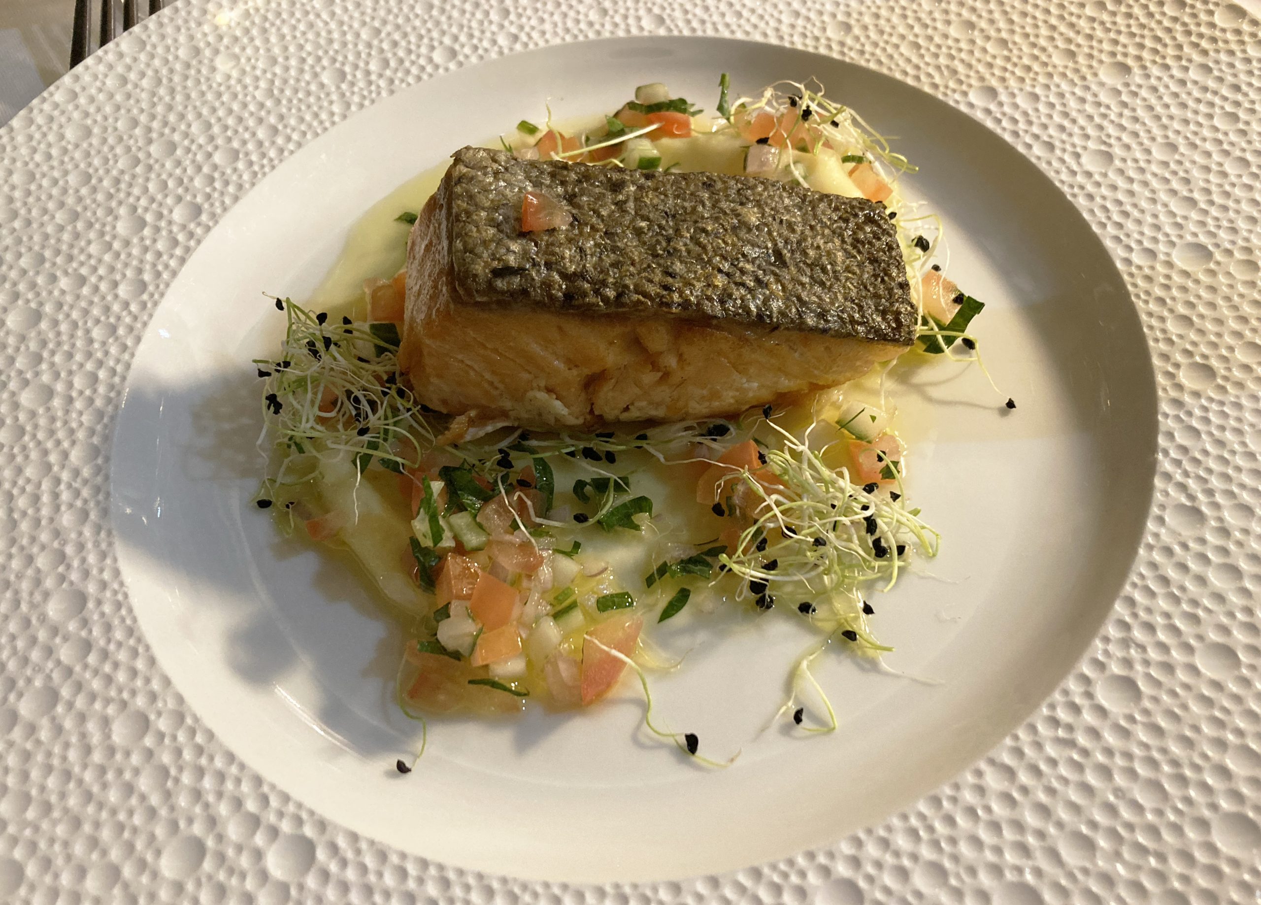 Es folgt der Hauptgang mit Fisch, der sehr gut auf der Hautseite angebraten wurde und auf dem Teller fein auf klein gewürfeltem Gemüse angerichtet wurde. Das spektakuläre an diesem Hauptgang ist aber eher der metallene durchlöcherte Teller, oder wie man das Gebilde auch immer nennen will.