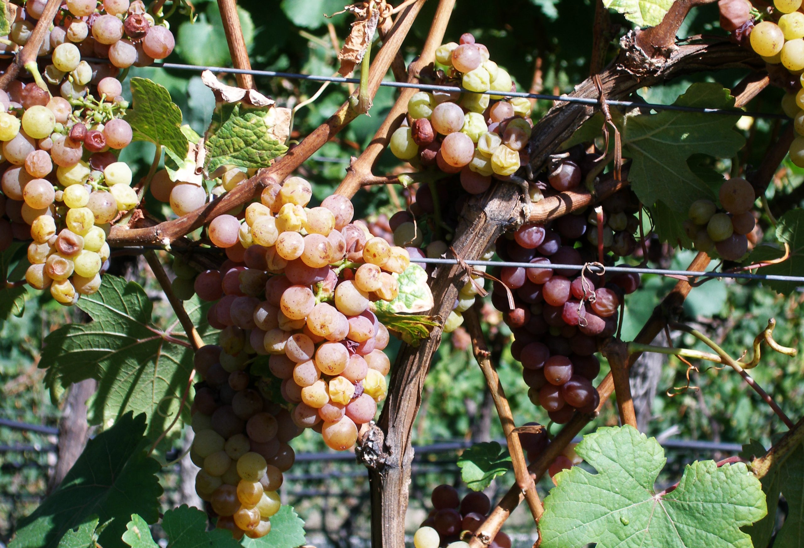 Die typischen Traubenfarben der Gewürztraminer in den Weinbergen von Südtirol.