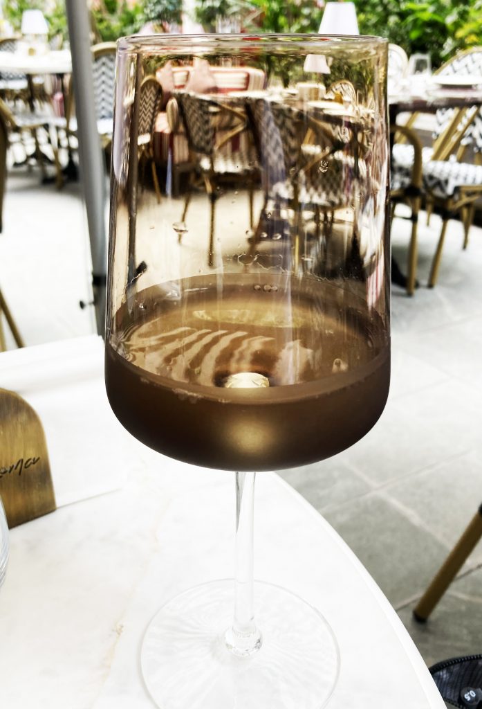 An diesem letzten Tag in Dubai hatte ich mir kein Programm vorgenommen und sonst auch keine größeren Aktivitäten geplant. Zum Mittagslunch kehrte ich nicht so besonders weit weg von meinem Hotel in ein Bistro ein, welches an diesem Sonntag Mittag noch recht leer war und ich mich auf der Terrasse einen Platz ausgesucht hatte. Zum Essen ein Gläschen Wein bestellt, welches in den meisten Lokalen in Dubai bei 0,15 l von der Menge her liegt. Und da erlebte ich eine kleine Überraschung. Denn so ein Weinglas hatte ich bisher noch nirgends gesehen. Die Füllmengenmarkierung war durch eine Tönung des Glases markiert wie auf dem Bild deutlich zu sehen ist.