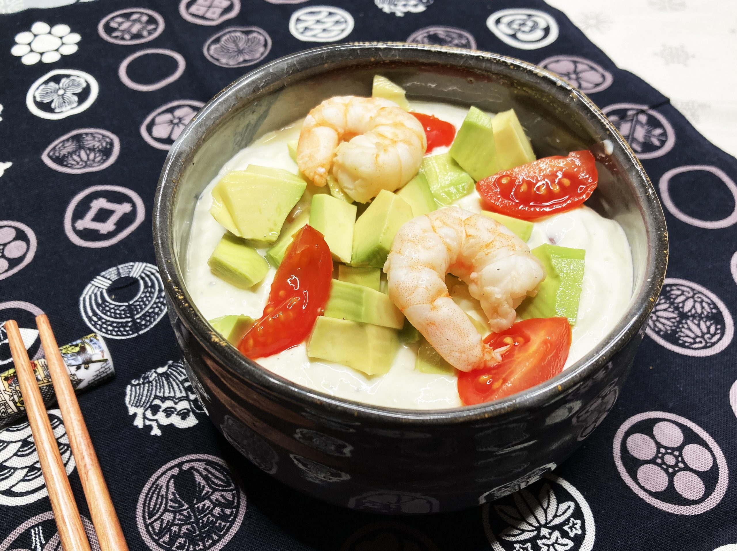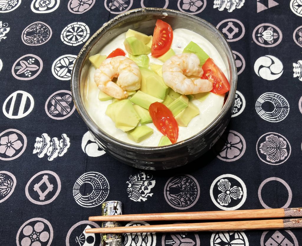 Ich beginne mit dem Dünsten der Garnelen, welche entweder vorher geschält wurden, oder bereits fertig beim Fischhändler eingekauft wurden. Während die Garnelen dünsten zerkleinere ich die Avocado und schneide diese in mittelgroße Stücke und beträufle diese sofort mit dem Zitronensaft, so das die Avocado nicht braun wird, als nicht oxidiert. Dann den Ingwer schälen und auf einer entsprechenden Reibe fein reiben und beiseite stellen. Wenn soweit dann ale Zutaten vorbereitet sind können die Avocado und die kleingeschnittenen Garnelen, bis auf 2 Teile on top in die Basismasse eingerührt werden. Der Ingwer wird dann ebenso in die Basismasse eingerührt. Leicht umrühren und mit Salz und Pfeffer abschmecken. Zu guter Letzt die 2 zurückbehaltenen Garnelen oben auf legen und servieren. In einer schönen Schale serviert sieht das dann so aus: