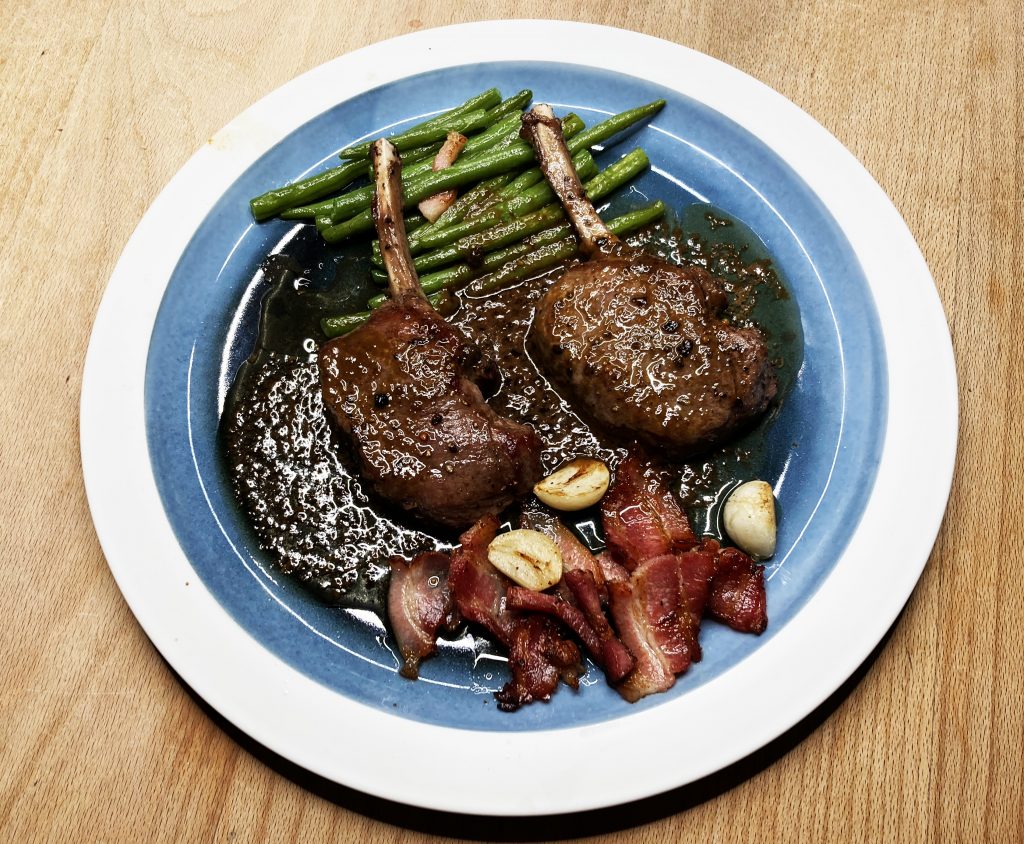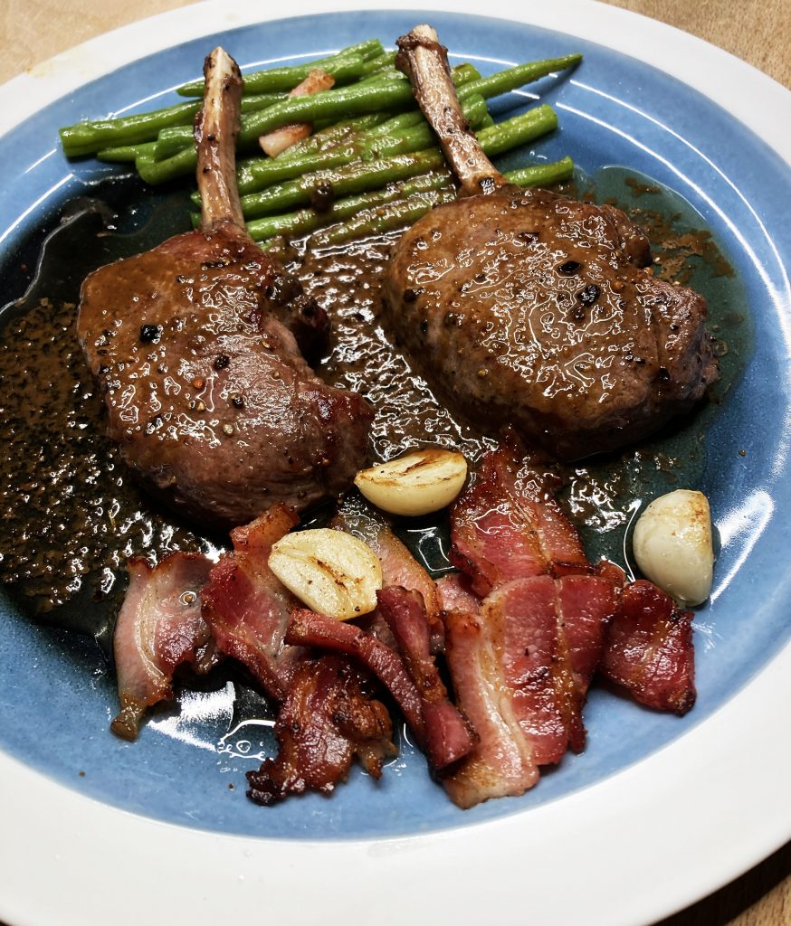 Die Zubereitung geht recht einfach und schnell, wenn man sich alle Zutaten bereitgelegt hat. Die Bohnen an den Spitzen kürzen und in kochendem Wasser für ca. 10 Minuten vordünsten. Dann das Fleisch parallel würzen und in einer schweren Pfanne, welche in den Backofen paßt von beiden Seiten für ca. 3-4 Minuten scharf anbraten. Den Speck in dünne Scheiben aufschneiden und in einer weiteren Pfanne scharf anbraten und mit dem geschälten Knoblauch zu Ende der Garzeit hinzugeben. Dann die Fleischpfanne in den Backofen, wo bei ca. 160 °C in der Pfanne fertiggaren. Vor dem Ofen schieben die Fleischstücke noch mit einem Schluck Portwein abgießen. Das ergibt dann nach der Garzeit im Ofen die Sauce, welche mit etwas Sahne oder Crème Fraîche verfeinert werden kann. Dann die Bohnen in die fertiggegarte Pfanne mit dem Speck kurz durchschwenken. Auf einem großen Teller servieren und mit einem kräftigen Rotwein genießen.